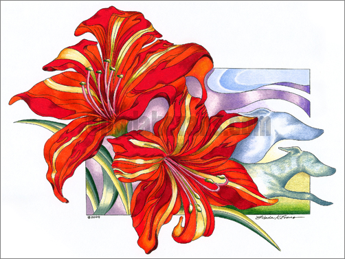 My first in a series of Greyhound Botanicals. We see our friends in everything of beauty and grace. This magnificent Amaryllis lily celebrates their presence in its delicate plumage. Can you find all 19?
