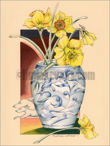 My inspiration for this, the third in my Greyhound Botanical Series, is the depiction of ancient lore and social mores in the classic pottery of Greek and Chinese artists. Our beloved greyhounds have been at the apex of this relationship for thousands of years. The daffodil has alwyas symbolized the re-birth of spring in our natural world. Find 8 greyhounds.