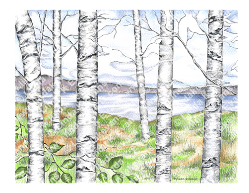 An inter-mountain lake provides the backdrop for this woodland symphony in black and white. Let your imagination run wild within the complex patterns of their bark. Find 30 greyhounds.